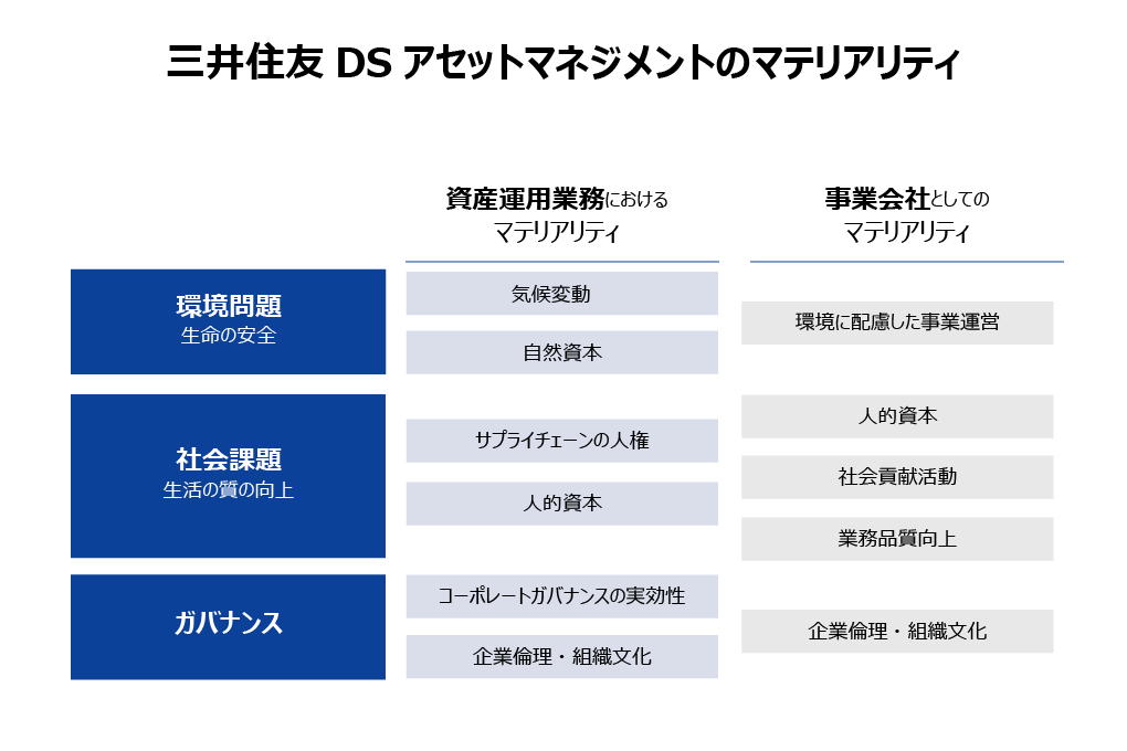 なお、2020年11月に公表した「当社のESG重点テーマ」は、このたび特定した「資産運用業務におけるマテリアリティ」に統合されました。