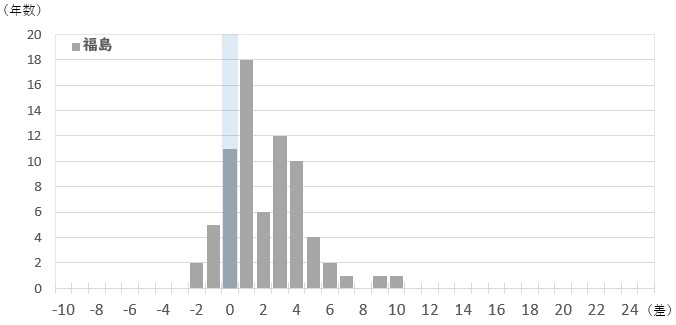 600℃の法則から計算された開花予想日から数日後に咲いているケースが多いようにも見えますが、73年間のうち54年(74.0%)は600℃を超えた日の前後3日以内には開花しており、東京と同様によく当てはまっていると言えるでしょう。また、東京では10日以上ずれている年もありましたが、福島では大きく外れる年は減っています。