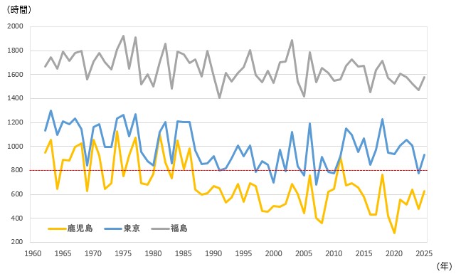 今回例に挙げた東京・福島・鹿児島において、休眠打破に必要な低温要求量を満たしているのかを、1時間ごとの気温のデータが取得できる1962年以降のデータで検証してみます。