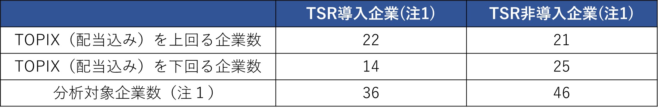 - TSRを導入している42社のうち、分析対象とした36社中22社(61%)がTOPIXを上回るパフォーマンスを示しています。