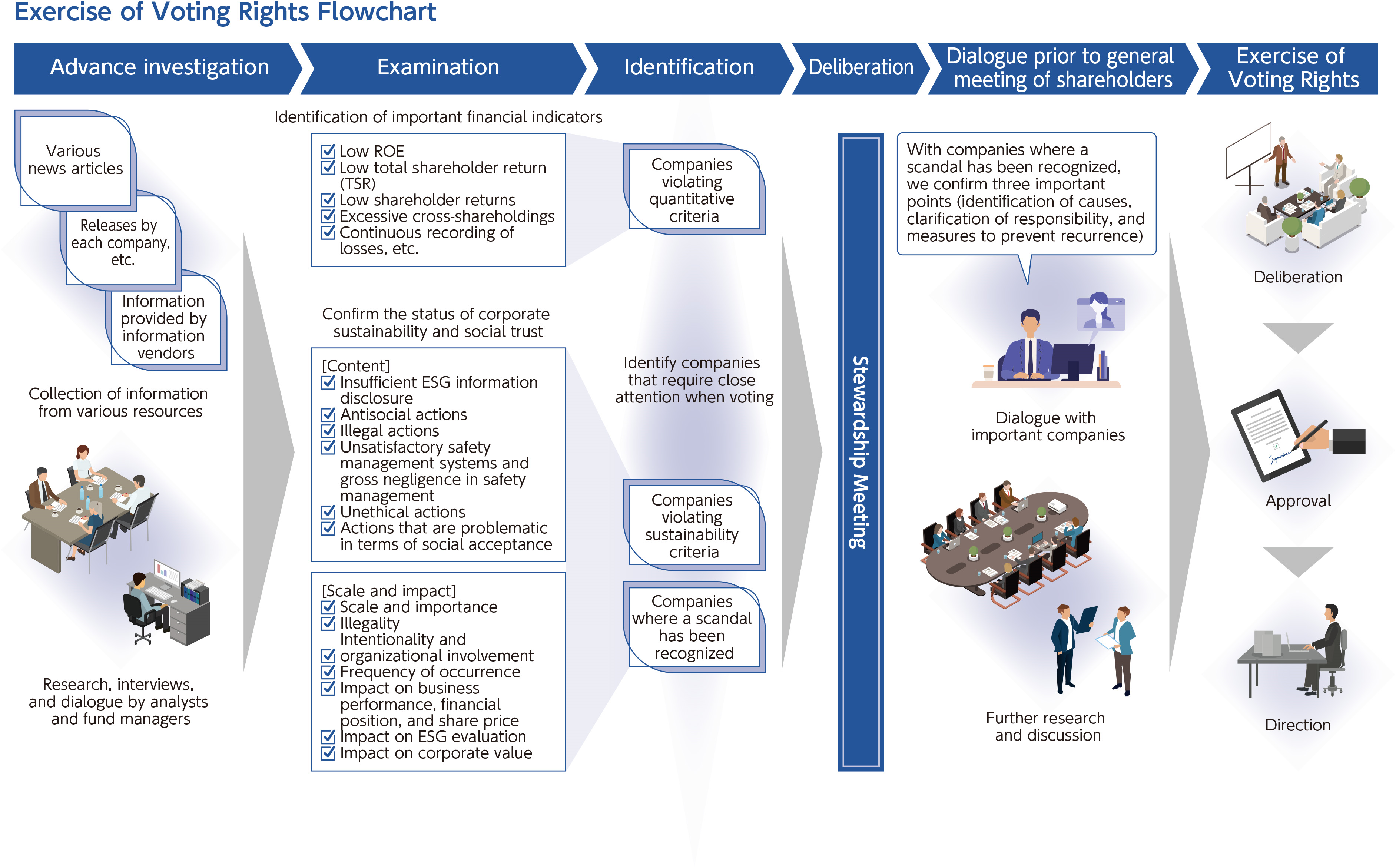 In accordance with the finalized in-house regulations, the Stewardship Committee deliberates on the formulation of the Basic Policy and specific criteria for the exercise of voting rights (hereinafter referred to as "Criteria for Determining the Exercise of Voting Rights"), the development of practical execution processes, and the creation of a structure, etc. to handle instructions for the exercise of voting rights, whereupon the matter is then approved by the Responsible Investment Officer.