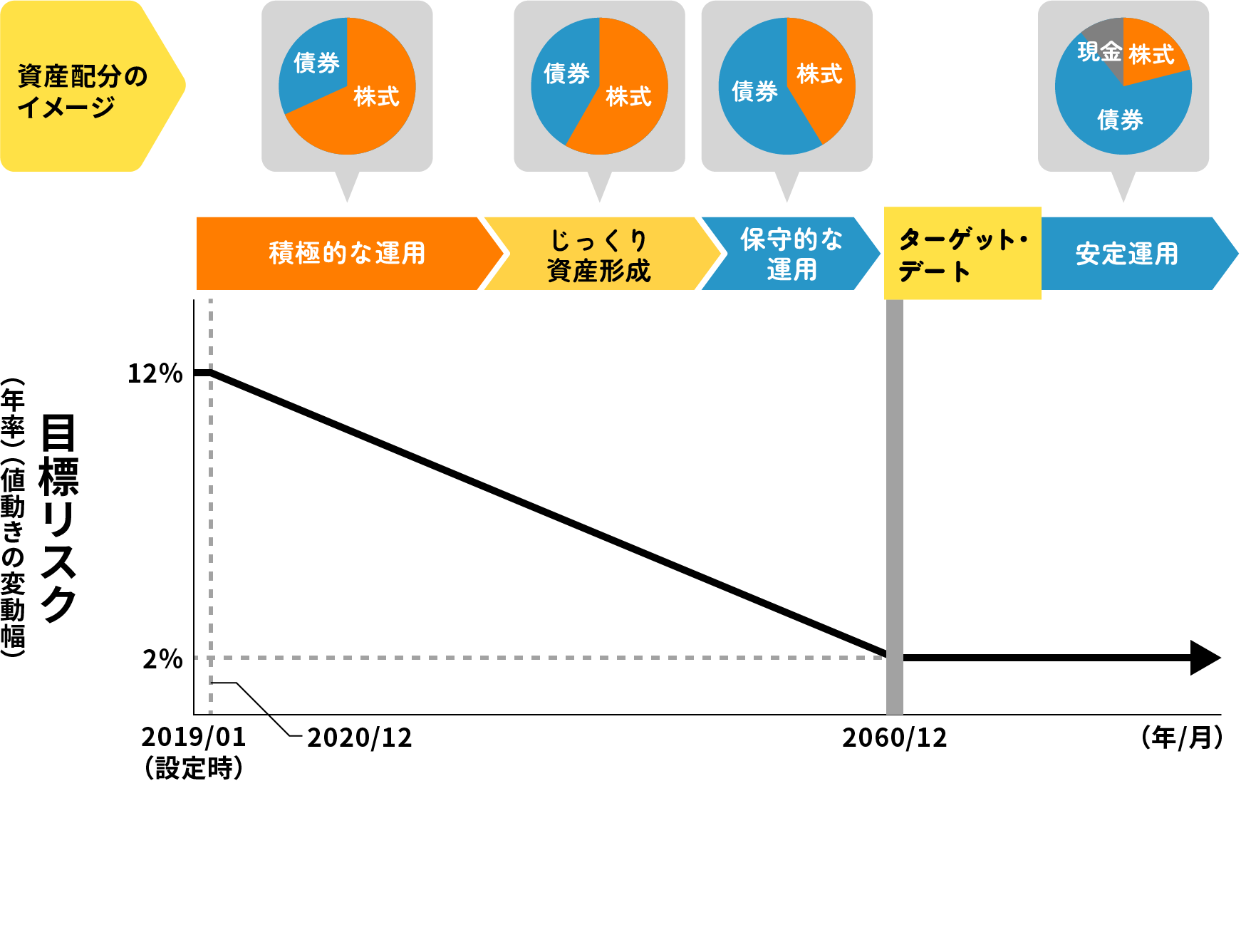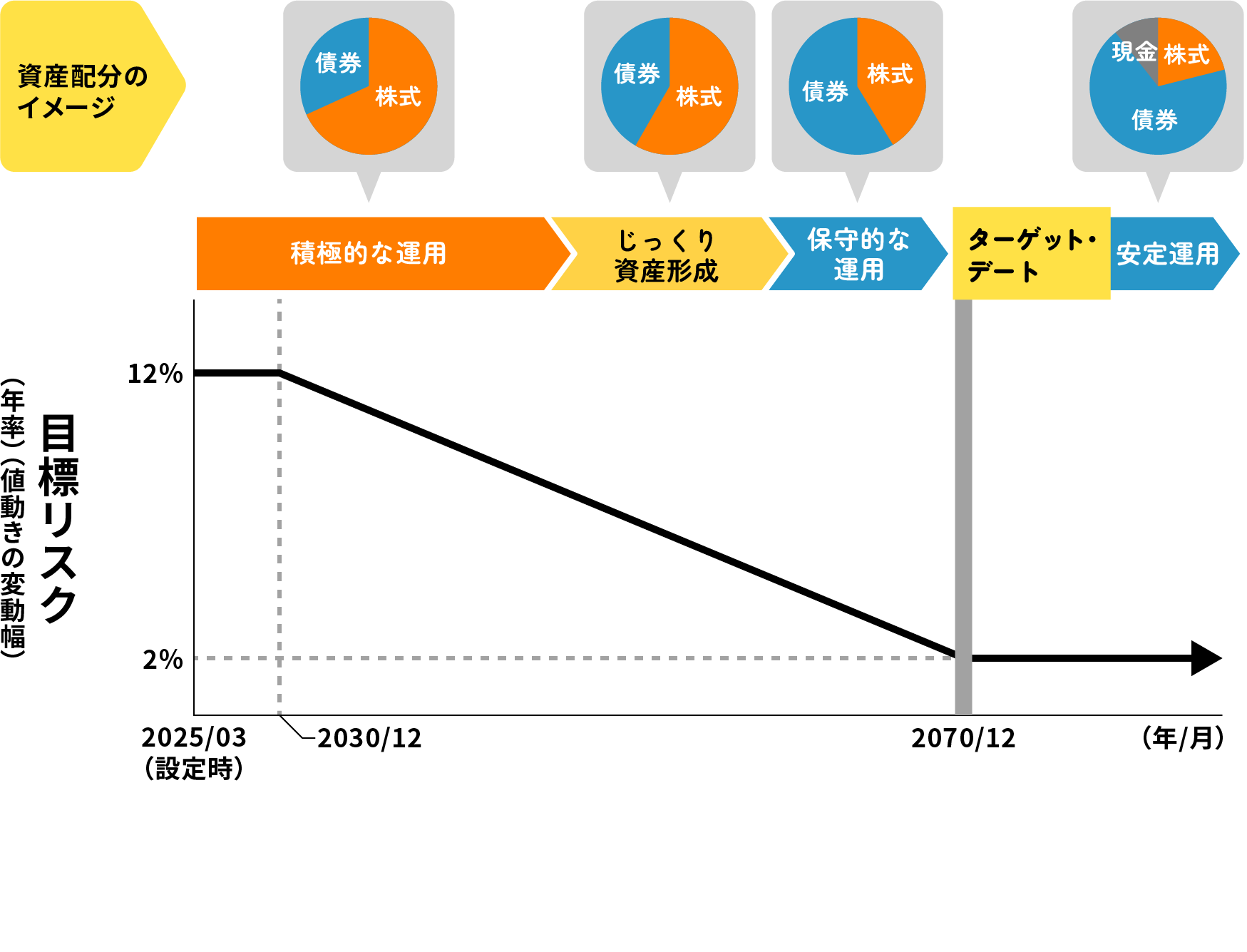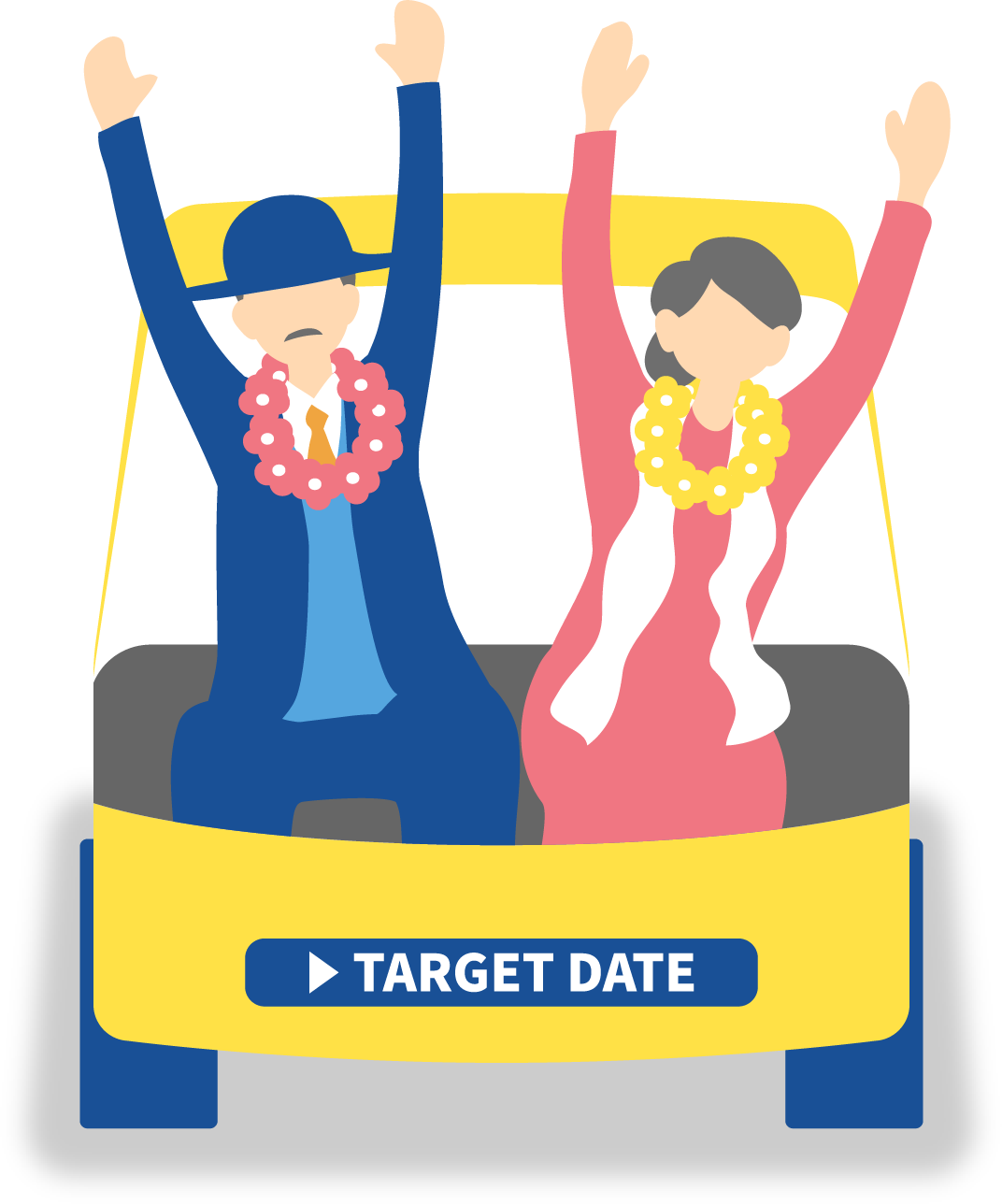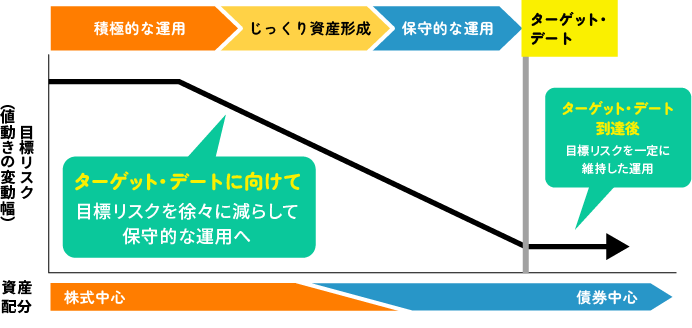 「ひとくふうターゲット・デート・ファンド」とは資産形成の目標となるターゲット・デート(退職時期など)に向けて、年齢に応じて最適な運用に切り替えていくファンドです。
