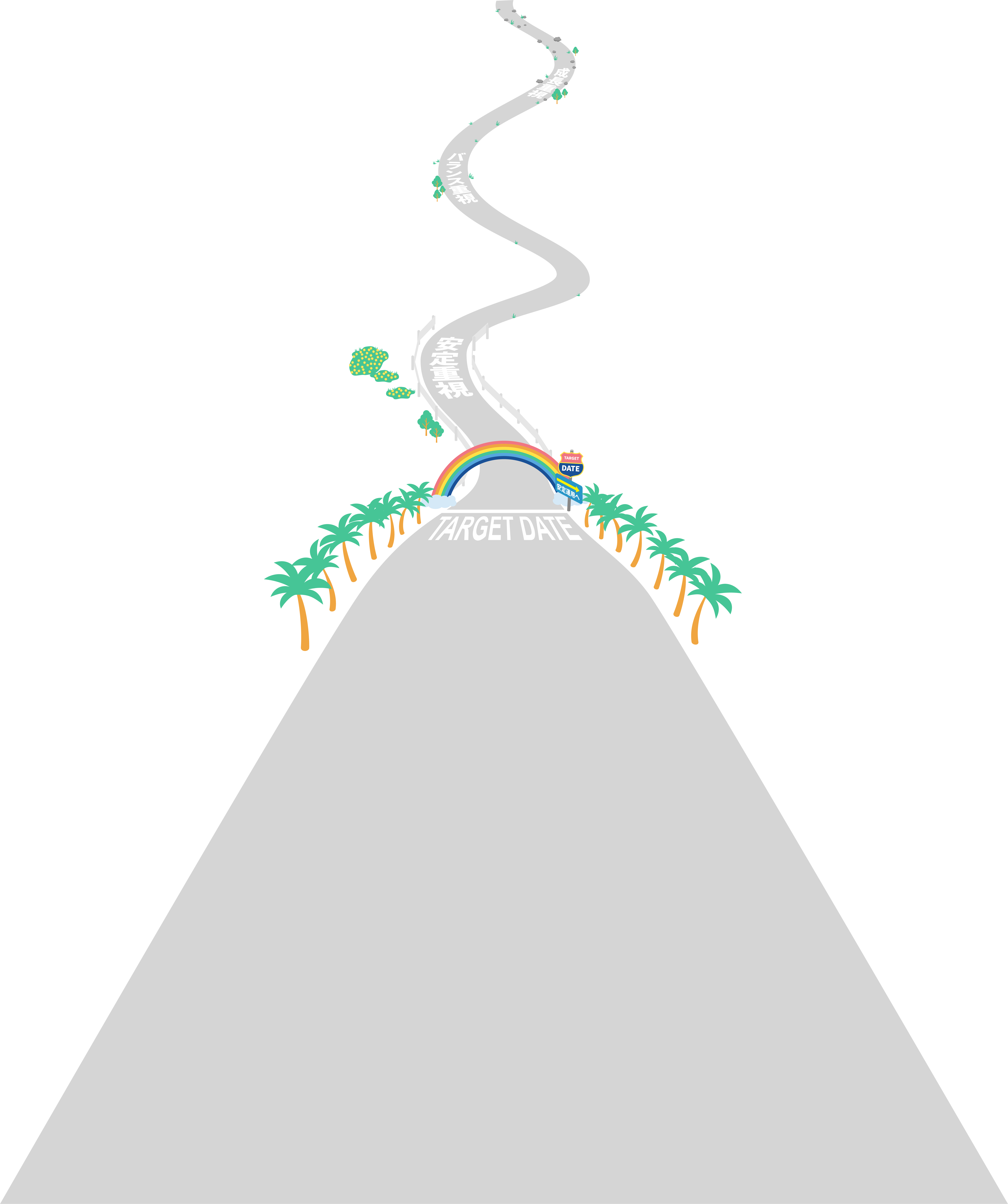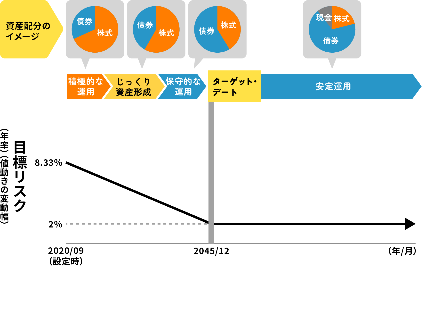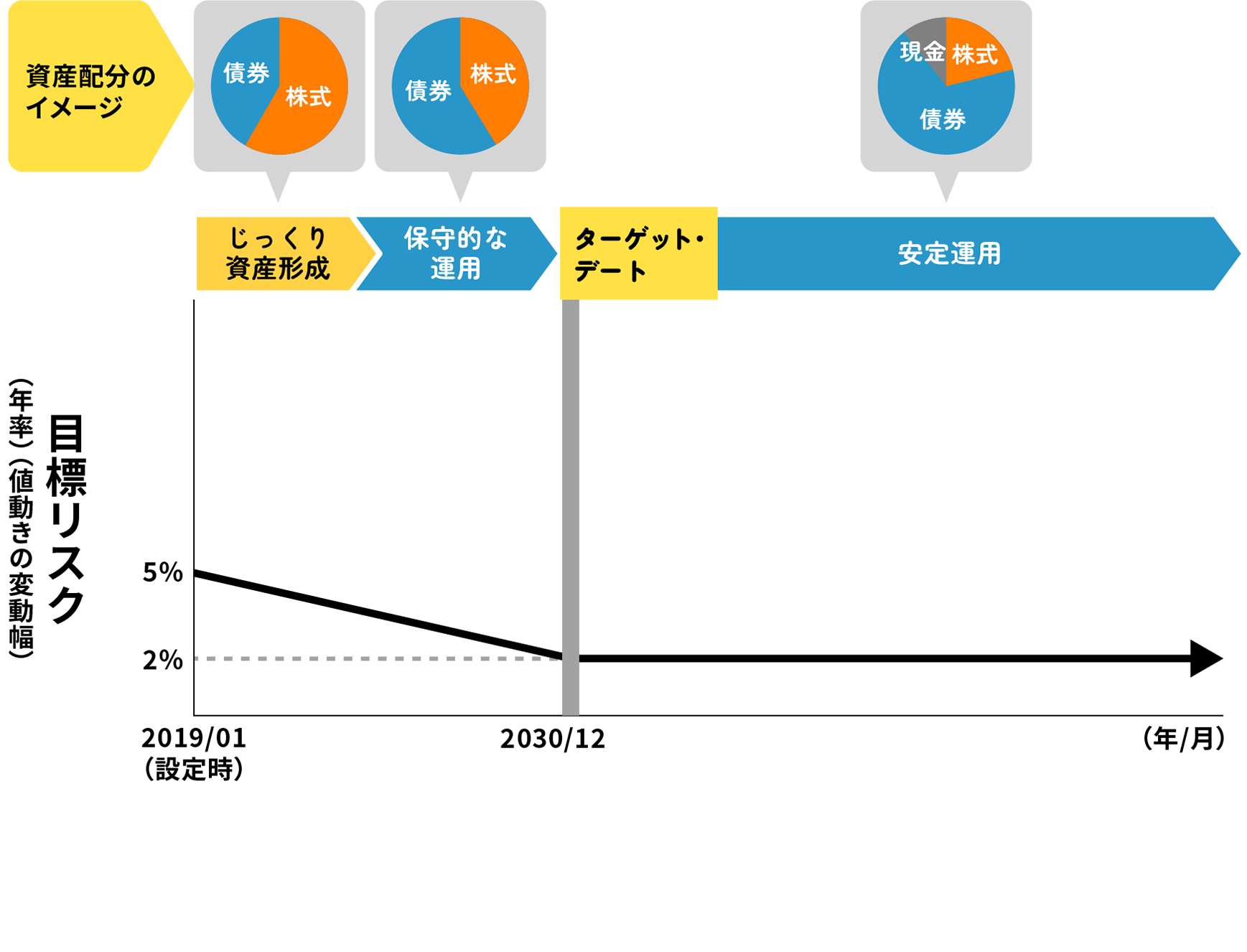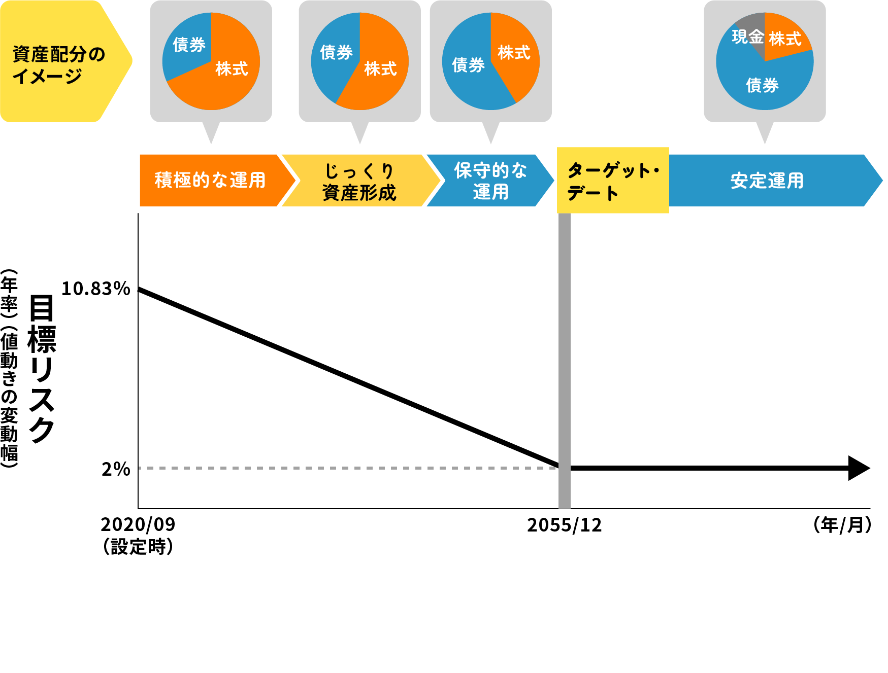 「ひとくふうターゲット・デート・ファンド」とは資産形成の目標となるターゲット・デート(退職時期など)に向けて、年齢に応じて最適な運用に切り替えていくファンドです。