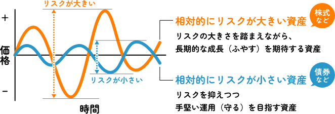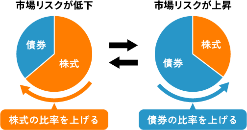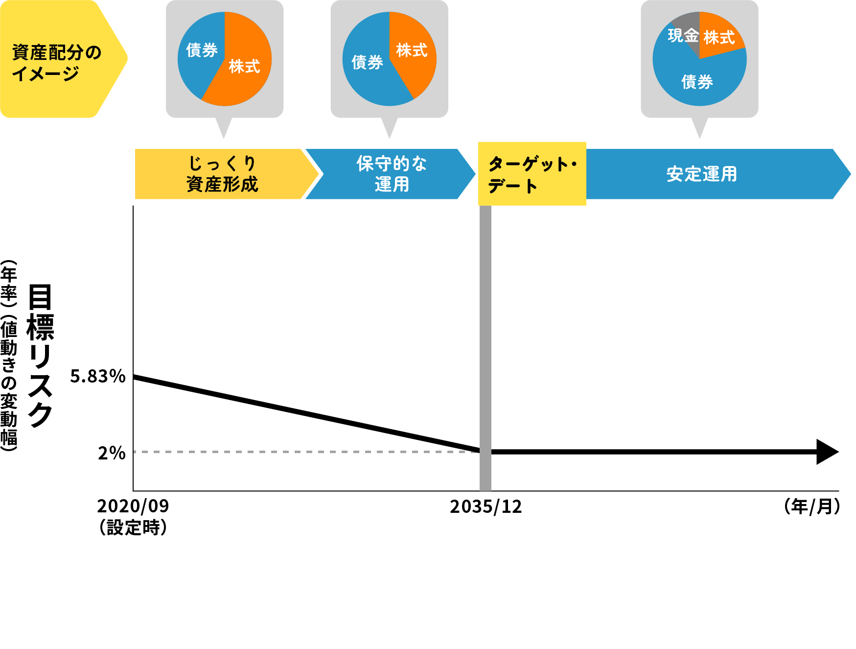 - 当資料の資産配分の円グラフはイメージであり、実際の配分とは異なります。また、各ファンドの基準価額の値動きの変動幅(年率標準偏差)が、目標リスク(年率)の範囲に収まるとは限りません。資金動向、市況動向等によっては、上記のような運用ができない場合があります。