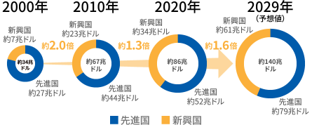 三井住友DS・DCターゲットイヤーファンドは、一般的なターゲットイヤーファンドが組入れる、日本を含む先進国の株式・債券だけでなく、新興国の株式・債券、日本を含む先進国のリートなど、8つの資産に分散投資し、世界経済の成長を享受します。なお、8つの資産はそれぞれ、一般的な指標(ベンチマーク)の動きに連動する投資成果を目指します。