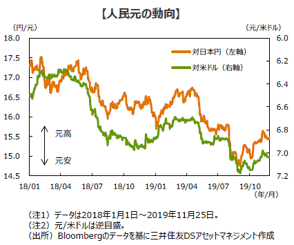 ■人民元は8月、トランプ大統領が第4弾の制裁関税を示唆したことを契機に、それまで「心理的な防衛ライン」とされていた1ドル=7元を割り込み、約11年ぶりの安値水準に下落しました。市場では当時、米中対立が激化し、習近平指導部が元安容認に動いたとみられていました。米国は中国を為替操作国に指定し、人民元は9月には一時7.17元台まで下落しました。しかし、10月に米中閣僚級会議が行われ、暫定的な部分合意に至ったことで、米中の対立が緩和に向かうとの見方から反発し、元高・ドル安が進みました。11月上旬には米中貿易交渉が前進するとの期待から人民元を買う動きが強まり、約3カ月ぶりに6元台を回復する局面もありました。その後は、米中協議の進展期待がやや後退し、再び7.0元台に押し戻されています。