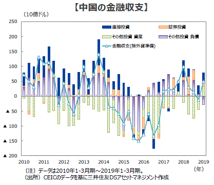 ■金融機関を中心とする短期資金の動きを示す「その他投資」を通じた資本移動をみると、米金利先高観が後退したことをうけ、2019年1-3月期は流入となりました。2015~2016年のチャイナショック時とは異なり、中国からの資金流出圧力は限定的になっています。中国当局が管理強化に努めていることから、当時のような資金流出は示現しないとみられます。