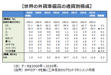 ■世界の外貨準備高における人民元の比率は2016年が1.0%でしたが、徐々に上昇してきており、2019年3月は2.0%になっています。今後、中国が人民元決済の推進など段階的に通貨の国際化を進めてゆくとみられる一方、グローバルにドルの比率を下げる傾向がみられはじめていることなどを考えると、外貨準備高における人民元の比率は上昇傾向をたどる可能性が高いと思われます。
