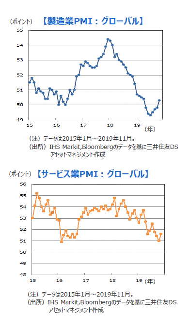 ■世界経済を企業の景況感という観点から見ると、米中対立を背景に製造業が悪化を続ける一方で、堅調な雇用・消費などを背景にサービス業(非製造業)が下支えとなるというパターンが続いてきました。しかし、ここにきて変化の兆候が見られ始めています。