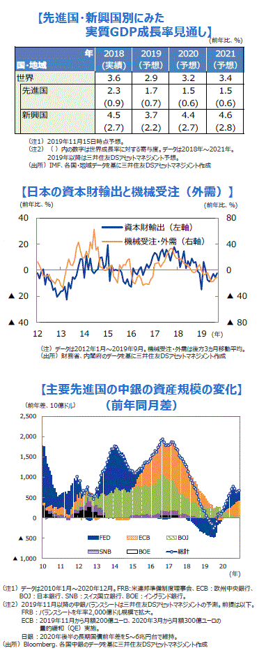 ■サービス業が堅調を維持する中で製造業が底入れし始めたことから世界の景気は底割れを回避し、2020年1-3月期前後から持ち直す可能性が高まってきました。米中協議の進展は依然として不透明感が強い状況ですが、弊社では世界経済の実質GDP成長率が、2019年の前年比+2.9%の後、2020年が同+3.2%、2021年が同+3.4%と緩やかながら回復していくと予想しています。