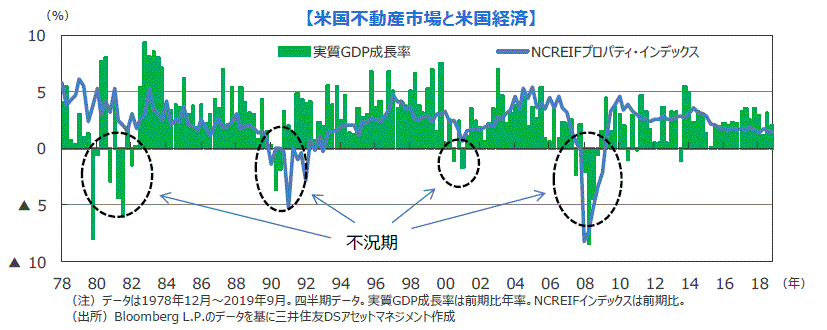 ■このNCREIF指数をGDP成長率と共に長期で見てみると、過去40年間で、経済成長が持続的にマイナス圏に陥ったことは4回ありますが、不動産価格が持続的に下落する本格的な調整を迎えたのは2回にとどまります。