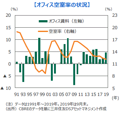 ■米国のオフィス空室率も、商業用不動産の需給の様子をうかがい知る参考となります。米国の大手不動産調査会社CBREのデータによると、米国主要52都市のオフィス空室率は2009年をピークに低下傾向にあり、2019年は約12%と1991年以降の長期の平均値をやや下回る水準です。