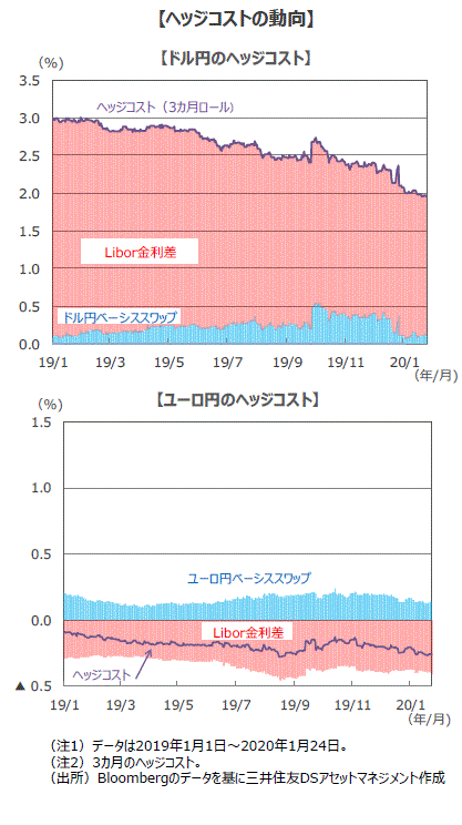 ■ドル円のヘッジコストは、2019年に年初の2.99%から年末の2.07%まで低下しました。足元(1月24日)では1.95%と2%を割り込んでいます。米連邦準備制度理事会(FRB)が昨年7月以降3会合連続での利下げを行い、日米金利差が縮小したことが主要因です。加えて、ベーシススワップ(上乗せ金利)も低下しています。ドル需給の引き締まりで10月初には一時0.55%まで上昇しましたが、足元では0.11%程度に低下し、落ち着いています。
