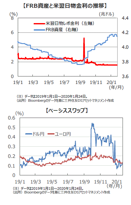 ■昨年9月に米翌日物レポ金利が一時急上昇するなど、ドルの資金需給がひっ迫したため、ドル円のベーシススワップは、 0.5%を上回る水準まで上昇しました。これに対し、FRBは10月には短期国債の買い入れを再開し、バランスシートの再拡大に踏み切りました。FRBによる短期国債買い入れに伴うドル資金の供給で、ドルの需給が緩み、ベーシススワップは年末にかけて、大幅に低下しました。その後も安定して推移しています。