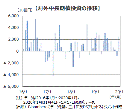 ■2020年に入り、国内投資家の外国債券への投資が息を吹き返しています。財務省の対外・対内証券投資のデータによると、日本勢の外債(中長期債)の買越額は、昨年12月に8カ月ぶりに売り越しに転じましたが、今年1月の週次データによれば、年初の第1週に2兆3千億円の買越額となり、週次では18年9月以来の高水準となりました。