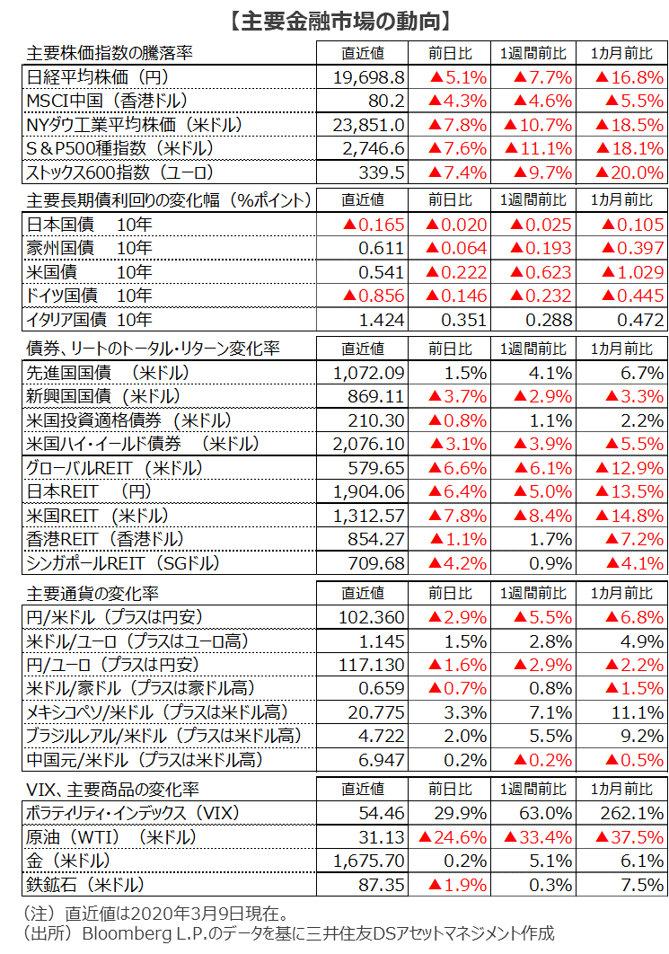 ■2月下旬以降、新型肺炎の米欧での拡大と共に世界の金融市場は動揺し始めていましたが、先週末から週明けにかけては石油輸出国機構(OPEC)とロシアが減産協議に失敗したこと等を受け原油価格が急落し、金融市場は混乱に拍車がかかっています。