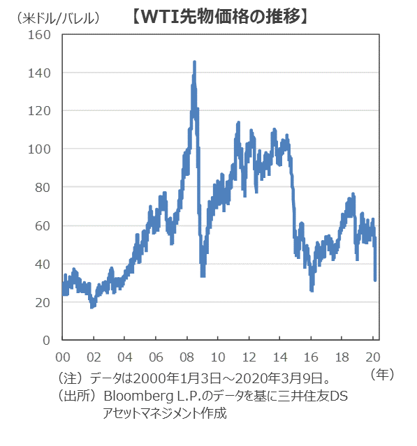 ■次に原油価格急落の影響を考えます。原油価格は3月9日に急落し、代表的な指標の一つであるWTI(ウェスト・テキサス・インターミディエート)の先物(期近物)の価格は一時27ドル台をつけました。3月6日のOPECプラスで協調減産案にロシアが難色を示し、会合が不調のまま終了したこと等が要因です。