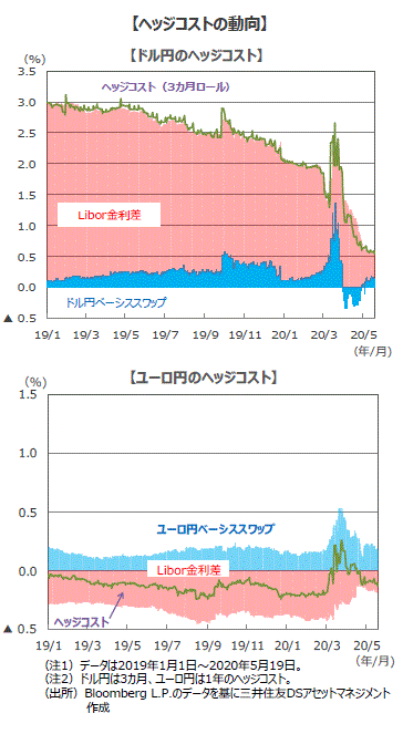 ■ドル円のヘッジコストは、世界的な新型コロナ感染拡大の影響から乱高下しました。3月中旬に一時2.65%まで急上昇した後、足元(5月19日)は0.54%程度まで大きく低下しました。3月中旬のヘッジコストの上昇は、新型コロナ感染拡大と原油価格の急落を受けた金融市場の混乱によってドル需要が急速に高まったため、ベーシススワップが急上昇して米利下げによる日米金利差の縮小を上回ったためです。