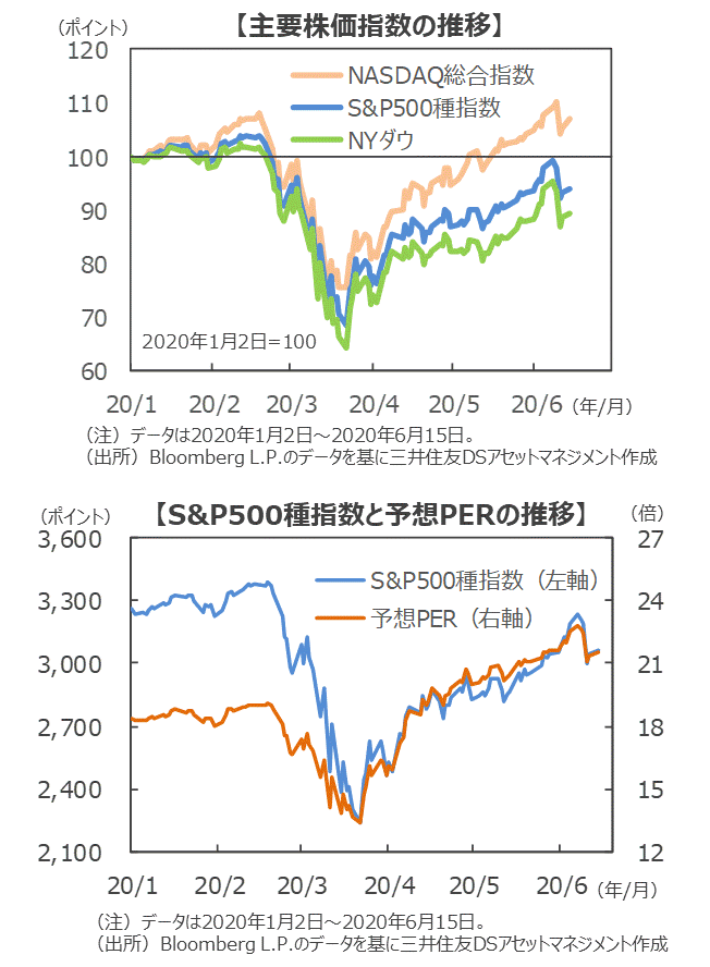 ■マクロ経済の大幅悪化が見込まれる中で、20年の業績見通しも大幅に悪化する見通しです。20年のS&P500種採用銘柄企業の1株当たり予想利益は前年比▲23.3%と予想されます(リフィニティブ、6月10日現在)。この減益を反映した12カ月予想ベースの株価収益率(PER)は株価急落前の6月10日は22.4倍でした。過去平均などと比較すると、22倍台のPERは割高感があります。