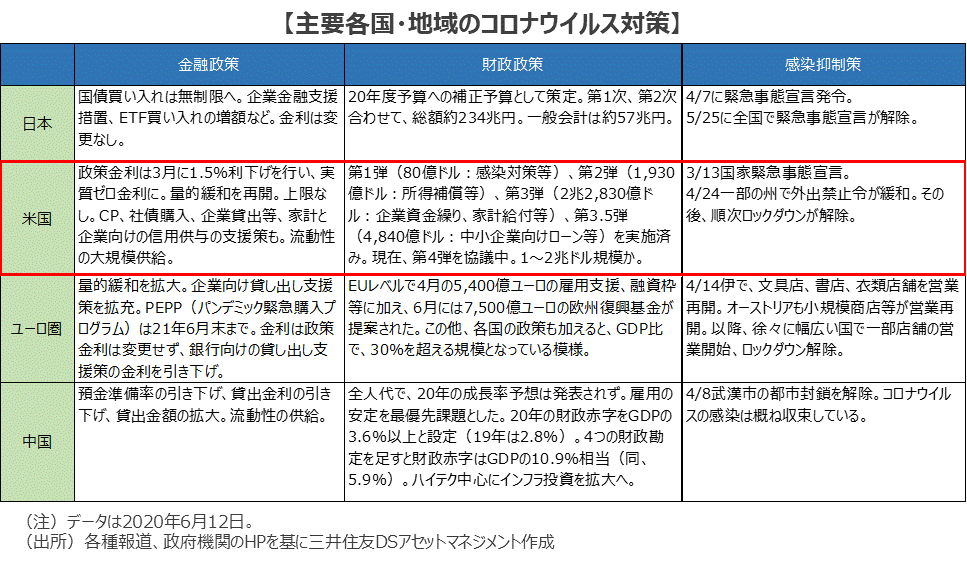 ■主要国・地域は、金融財政政策と共に積極的に感染抑制策を発動してきました。その抑制策は成果をあげ、中国や先進国などで都市封鎖(ロックダウン)が段階的に解除され、中国の鉱工業生産や、米国の5月雇用統計など、実際に経済が改善を始めたことを示す指標が出ています。但し、足元では、米国で経済活動の再開を行った人口の多いテキサス州、カリフォルニア州などで感染が再拡大しています。また、韓国や中国、日本でもやや感染者が拡大する傾向にあります。