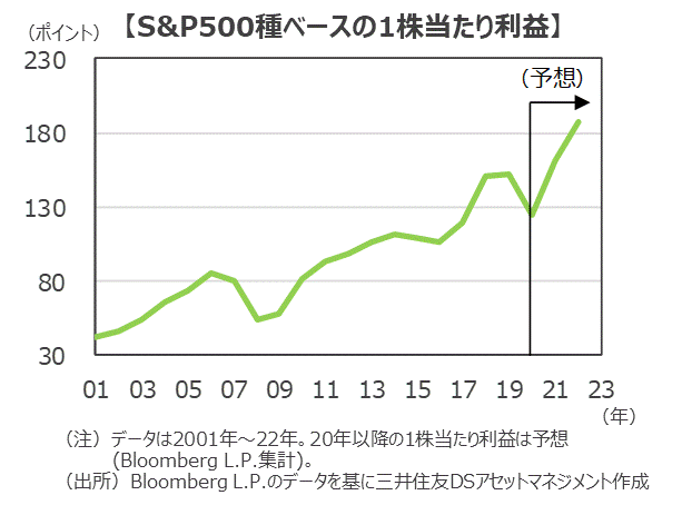 ■更に、Bloomberg L.P.の集計では、22年の予想利益は187.81ポイントで、20年の同125.21ポイントから年率で+22.5%と大幅な成長が見込まれています。