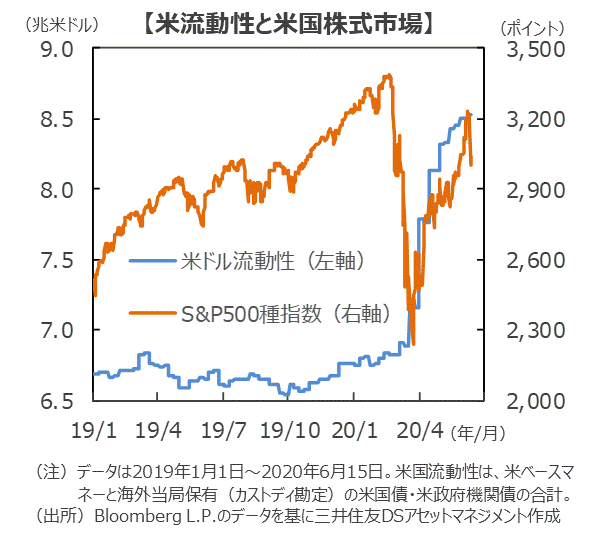 ■米株が堅調に推移している背景として、大幅な流動性の増加を指摘できます。米国のベースマネーに、海外当局が保有するカストディ勘定の米国債・米政府機関債を足し合わせた「米ドル流動性」は3月から急拡大しています。合わせて、長期金利も大きく低下しており、インフレ期待を差し引いた実質金利はマイナスとなっています。これらは米国の金融環境が大きく緩和的になっていることを示しています。