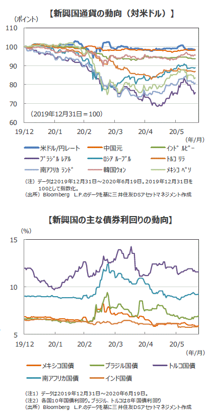 ■新興国債券の利回りはまちまちの動きなっています。2019年末に比べ、トルコ、メキシコ、インドは利回りが低下した一方で南アフリカとブラジルは上昇しました。3月は金融市場の動揺を受けて新興国債券が売られ利回りが上昇したものの、各国中銀の金融政策等を受けて市場は徐々に落ち着きを取り戻し、中国や先進国でのロックダウン解除に向けた経済再開への期待が広がった5月後半以降は、ワクチン開発への期待などもあり、総じて利回りは低下してきています。一部の新興国では新型コロナウイルスの悪影響が決定打となり、国債の格付けが引き下げられました。3月には更なる財政赤字の拡大が予想された南アフリカが、4月にかけては原油急落の影響を受けたメキシコの格付けが引き下げられました。ただしメキシコについては、見通しが安定的であることから投資不適格級となる懸念は小さいとみられます。