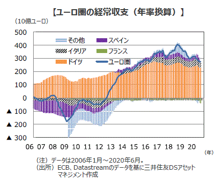 ■ユーロ圏は経常黒字の大部分をドイツを中心とする貿易黒字が占めており、恒常的に輸出に伴うユーロ買いが出るため、ユーロ高につながりやすいと考えられます。一方、日本は経常黒字国であるものの、コロナショックを受けて貿易収支が赤字となっていることから輸出企業の円買い需要も大きくなく、積極的な円買いが入りにくいとみられます。