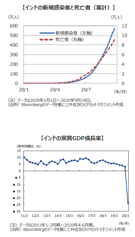 ■インドは3月末からコロナ対策として全土封鎖を実施したものの、感染が広がるなかで6月から経済活動を再開したため感染拡大が加速しました。封鎖の解除により、都市部から帰省した出稼ぎ労働者が地方にウイルスを持ち込み、感染が都市部から地方に広がりました。最近の新規感染は地方が中心で、医療体制が脆弱なことから感染拡大に拍車がかかっています。現状では感染者数のピークアウトの気配はみられず、コロナ感染の収束は見通せない状況です。