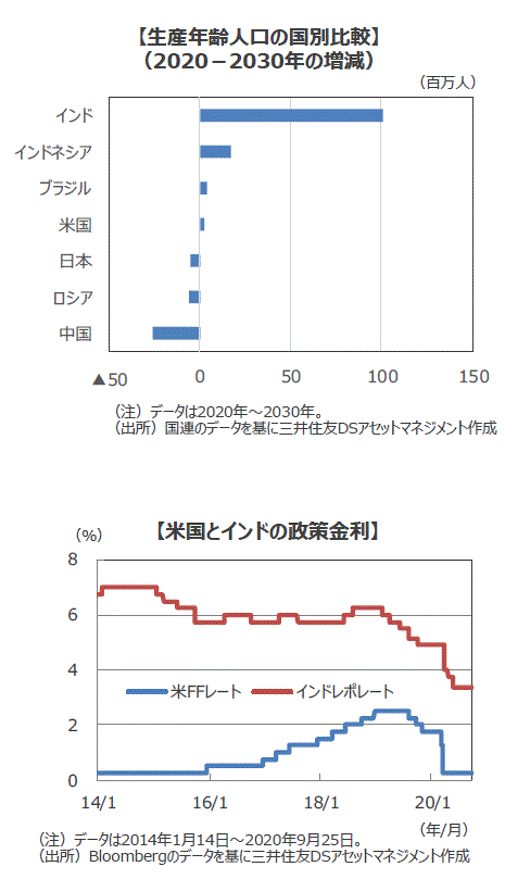 新型コロナの感染拡大とそれに伴う経済の停滞が当面インド株の足かせとなりそうです。しかし、中長期的な観点でみれば、ワクチン開発などにより、コロナ感染の拡大はいずれ収束すると考えられます。その際、重要なのはインドの相対的な成長期待の高さやグローバルな金融環境だと思われます。以下で中長期的な経済成長の背景となる人口動向および中央銀行の金融政策を確認します。