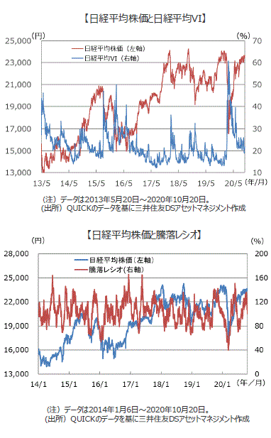 ■信用取引をみると小幅に増加していますが特に心配になる水準ではありません。現状のネット裁定残高、信用買い残の状況では、急落リスクは大きくなく、ショートポジションが下支え要因となりそうです。なぜショートポジションの高水準が続くかというと下落時に継続して入る日銀のETF買い(購入目標額12兆円)の影響が大きいと考えられ、ロングポジションが積みあがりにくい構造になっています。