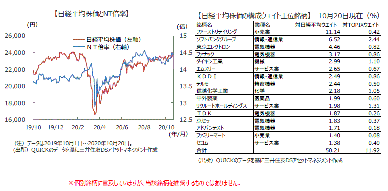 ■日経平均株価を東証株価指数(TOPIX)で割り、両指数の相対的な強さを示すNT倍率は2005年には10倍を下回っていましたが、その後はほぼ一貫して上昇しNT倍率は14倍台半ばの水準となっています。構成比上位銘柄の電気機器、医薬品、小売業などのグロース色の強い銘柄の株価が上昇し構成比が高まり、構成銘柄数は225銘柄にもかかわらず、ファーストリテイリングなど16銘柄で50%を占め非常にゆがんだ状況にあります。