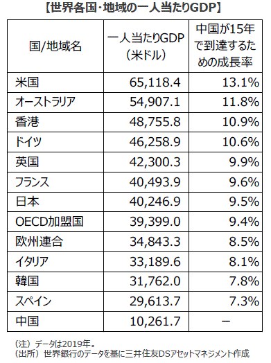 ■なお、2021年~2035年までの15年間で1人当たりGDPを倍増させるには、年平均4.7%の成長が必要です。世界銀行によると2019年の中国の名目GDPは約1万米ドルですので、この倍は2万米ドルです。過去、多くの新興国が1万ドルの壁を突破しきれなかったため、中進国の罠という言葉がありますが、中国はそれに陥ることなく成長を続けることが想定されている事になります。