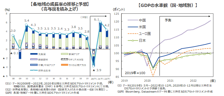 ■2021年のグローバル経済は、コロナ感染抑制等を背景とした景気減速から回復が本格化すると見ています。複数の種類のワクチンが接種可能となる見込みで、これも景気回復の確度を高めます。弊社では、2021年の世界経済の成長率を+6.1%、22年を+4.2%と見込みます。