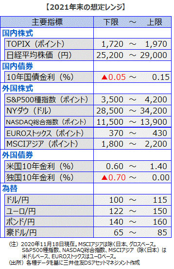 •年内はもう一段の水準の切り上げが期待でき、高値圏で推移する見通しです。来年1-3月はもみ合いで値を固める時期と考えられます。1月後半から始まる10-12月決算で業績の回復が続いていることを確認することになると思います。ただ、7-9月期の決算で業績の上振れはある程度織り込んでおり、また、11月以降の急騰の反動で、一旦もみ合う展開になると思われます。4-6月以降年末にかけては、循環的な景気回復と政策期待から業績回復を織り込む形で上昇すると考えています。