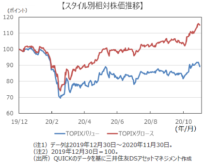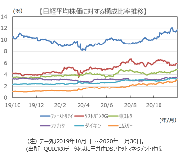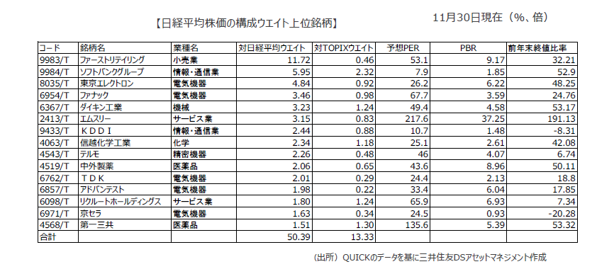 ■11月末時点で日経平均株価の構成比10%を上回る銘柄には、ファーストリテイリング、5%超はソフトバンクグループ、3%超には東京エレクトロン、ファナック、ダイキン工業、エムスリーがあります。昨年来騰落率は、日経平均株価が11.73%、TOPIXは1.95%に対して、エムスリー191.1%、ダイキン工業53.17%、ソフトバンクグループ52.93%、東京エレクトロン48.25%、ファーストリテイリング32.21%、ファナック24.76%となり、これら値がさ株が日経平均株価の上昇をけん引したことがわかります。