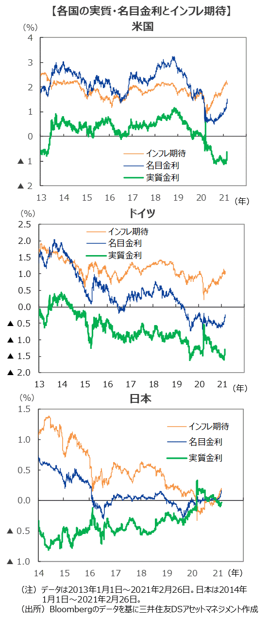 ■1月以降の世界的な名目金利の上昇は、景気拡大見通しを背景にインフレ期待の改善を受けたものでした。米国やドイツでは名目金利が上昇しています。これはインフレ期待が回復していることが背景です。さらに足元では、実質金利が上昇していることが市場の期待形成に影響を与えています。実質金利(10年国債利回りーインフレ期待)は、2月中旬以降、反発する展開となりました。ただ、米国の実質金利は▲1.1%から▲0.6%に反発しましたが、引き続き歴史的な低水準となっています。低水準の実質金利が景気やリスク資産市場にとって、重要なサポート要因となっている点を否定するほど景気が過熱しているわけではありません。主要中銀の証券購入を通じた潤沢な流動性供給も引き続き高水準を継続する見通しです。こうした過剰流動性は世界株式市場の堅調な推移をサポートすると期待されます。