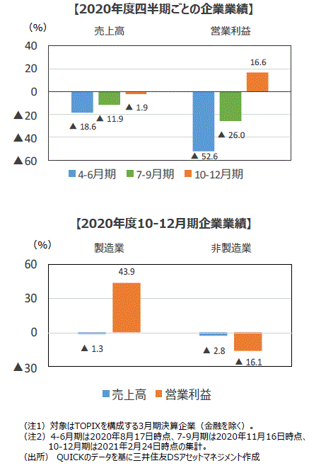 ■10-12月期業績の内容を見ると、製造業は同▲1.3%減収、同+43.9%増益となったのに対して、非製造業は同▲2.8%減収、同▲16.1%減益と回復が遅れています。これは非製造業は行動制限の影響が大きい空運業や陸運業の業績改善が遅れているのに対し、製造業は各国の経済対策によって生産活動が改善していることに加え、大規模な費用削減に取り組んでいることから業績改善が進んでいると考えられます。