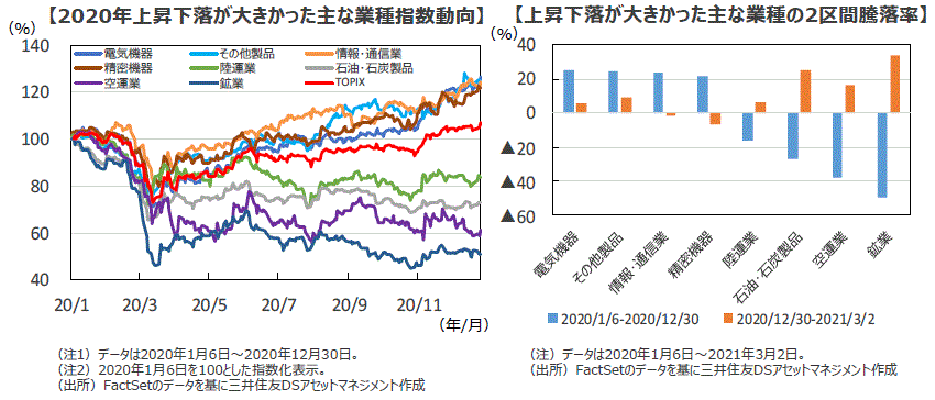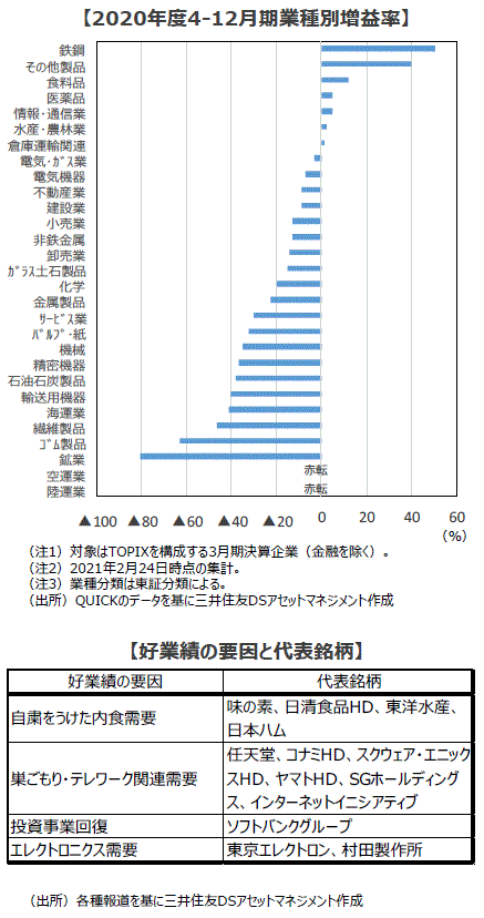 ■東証株価指数(TOPIX)の業種指数でみると、電気機器、その他製品、情報・通信業などの株価が大きく上昇する一方、鉱業、陸・空運業、石油・石炭製品などの株価は急落後の回復が限定的でした。これは新型コロナがもたらす事業環境の変化とそれらによる業績動向の差が背景となっており、まさにこの4-12月期業績を見越した動きであったと言えます。