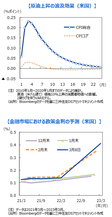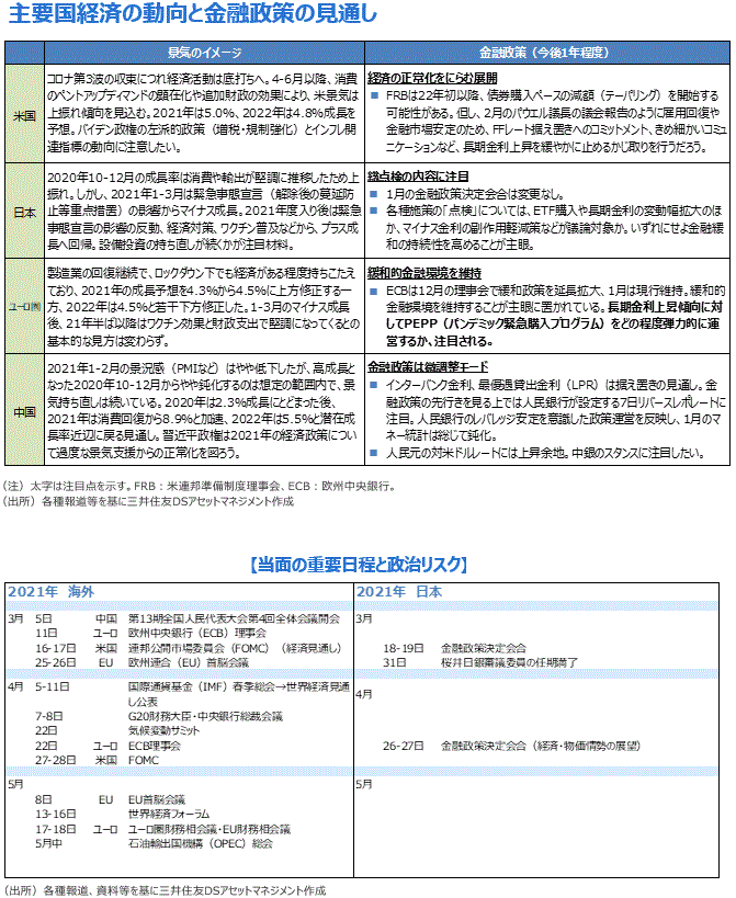 ■米10年国債利回りは3月初旬にかけて一時1.6%を上回り、年初から0.6~0.7%上昇しました。米国の2021-22年の成長見通しが上方修正されたことが主因ですが、これには二つの要因があります。第一に、イスラエルなどの事例でワクチンが実際に感染を抑制することが示唆され、ワクチン接種で先行する米英で4-6月以降、経済が正常化するとの期待が高まりました。第二に、バイデン政権の1.9兆ドル規模となる追加コロナ対策が、ほぼ減額されずに実施されることとなりました。民主党が上下両院で多数を占めていることもあり、バイデン政権の最初の2年間の財政政策が想定よりも拡張的になることを示唆していると思われます。