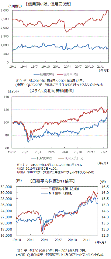 ■コロナ禍によるパニック的な売りからネット裁定残高は昨年5月25日時点で異例の▲8.85億株となり、マイナス水準が長期間続いてきました。3月4日時点で0.22億株と昨年の1月8日以来のプラスとなり、今回の上昇のけん引役となったショートポジションの買戻しは一巡したと想定されます。