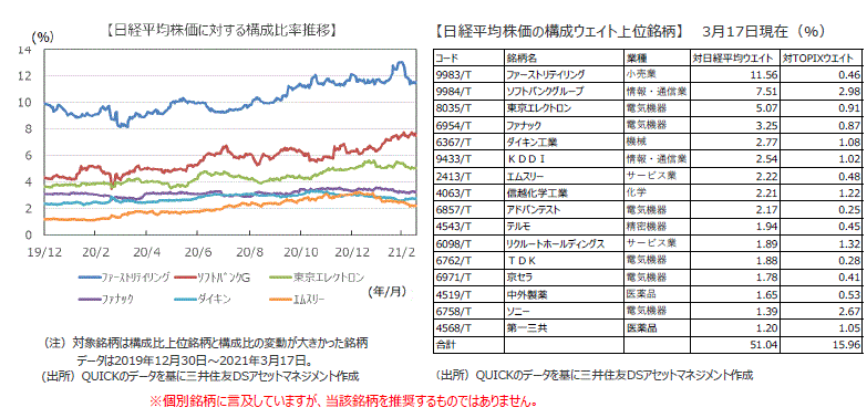 ■日経平均株価を東証株価指数(TOPIX)で割り、両指数の相対的な強さを示すNT倍率は、2005年には10倍を下回っていましたが、その後はほぼ一貫して上昇しNT倍率は15倍台の水準となっています。構成比上位銘柄の電気機器、医薬品、小売業などのグロース色の強い銘柄の株価が上昇し構成比が高まり、構成銘柄数は225銘柄にもかかわらず、ファーストリテイリングなど16銘柄で構成比の50%を占め非常にゆがんだ状況にあります。