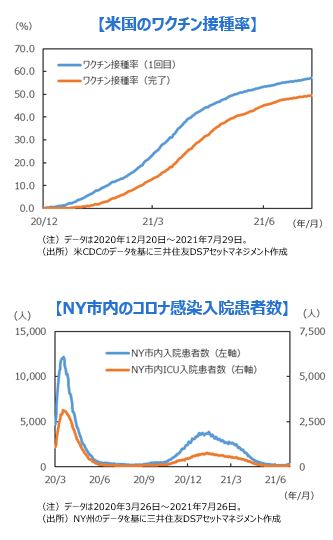 ■例えばワクチン接種で先行するNY州では人口比70%の接種目標に対し、7月29日時点で約75%の人が最低1回、約68%の人が全ての接種を完了しています。