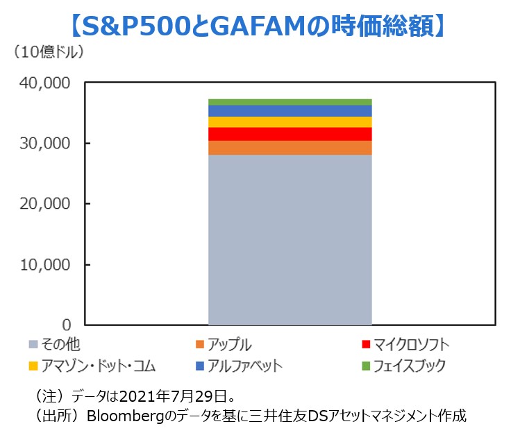 ■また、万が一デルタ型蔓延で景気が再び失速するような場合には、GAFAMのコロナ耐性やその成長力の希少性への市場評価が高まる可能性があります。加えて、景気減速を受けて金利が低下するようなら、成長株の一部に見られるバリュエーション面での過熱感も後退することから、これも米国株への追い風となりそうです。