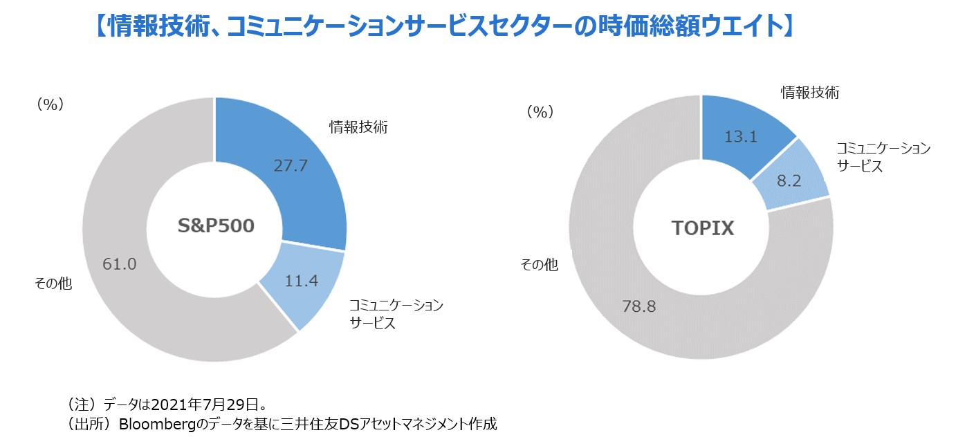 ■こうした変化の恩恵を受ける代表的な企業が、米国のGAFAM(グーグルの持ち株会社アルファベット、アップル、フェイスブック、アマゾン・ドット・コム、マイクロソフト)ですが、この5銘柄の時価総額はS&P500指数の約25%を占めます。また、GAFAMを含む情報技術及び、コミュニケーションサービスセクターの時価総額ウエイトはS&P500の4割弱にもなり、日本をはじめ他の市場と大きな開きがあります。
