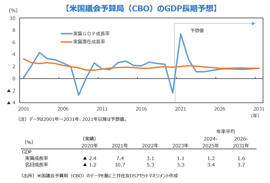 ■中でも、脱コロナで顕在化している繰り越し需要が一巡した後の、米景気の動向には要注意です。米国議会予算局(CBO)が今年7月に発表したGDP長期予想では、米景気の成長率は足元がピークとなっており、その後は急減速するものと見込まれています。特に2023年以降には潜在成長率の2%を下回る水準まで減速、2025年以降は労働人口の伸び率低下もあり、長期的な平均成長率を下回って推移するものと予想されています。こうした長期予想が現実のものとなる場合、最近話題の長期金利の低下がファンダメンタルズから正当化されるだけでなく、長期に及ぶ業績の下振れは米国株にとっても決して好ましくない経済環境といえ、注意が必要です。