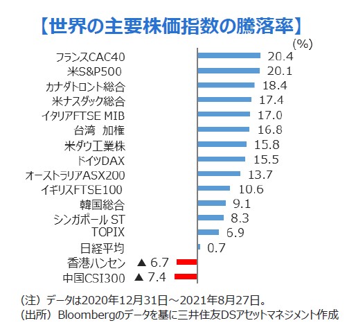 ■日本株の出遅れの背景には何があるのでしょうか。よく言われるのは、新型コロナウイルスのデルタ型蔓延による緊急事態宣言の発令や景気回復の遅れ、中国におけるIT業界や教育産業への突然の規制の導入といったところでしょうか。