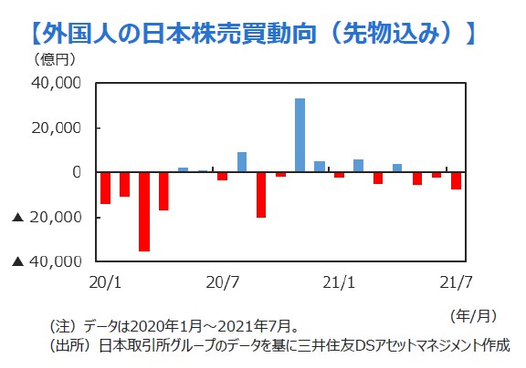 ■日本株出遅れの理由の一つとして、外国人投資家による日本株売りが挙げられます。投資主体別売買動向(先物込み)を見ると、外国人は今年4月から7月にかけて3カ月連続で売り越しとなっています。3カ月以上売り越しが続くのは、昨年春のコロナ感染第一波のパニック売り以来のことです。