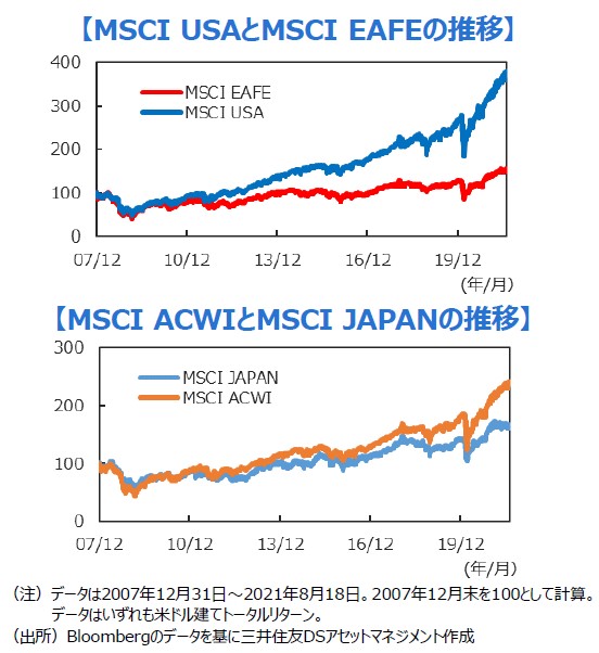 ■米国の投資家は海外への「国際分散投資」にあまり積極的ではありませんが、その背景には米国株の良好なリターンがあります。MSCI米国株指数とMSCI・EAFE指数(世界株指数から米国株を除外したもの)を比較すると、リーマンショック以降は米国株のアウトパフォームが続いています。