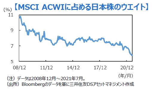 ■グローバルマーケットの中での日本株の位置づけは、特に米国株を中心とする海外市場の好調もあって、その存在感が低下しているように見受けられます。